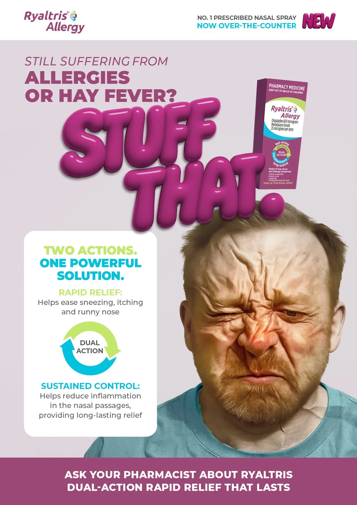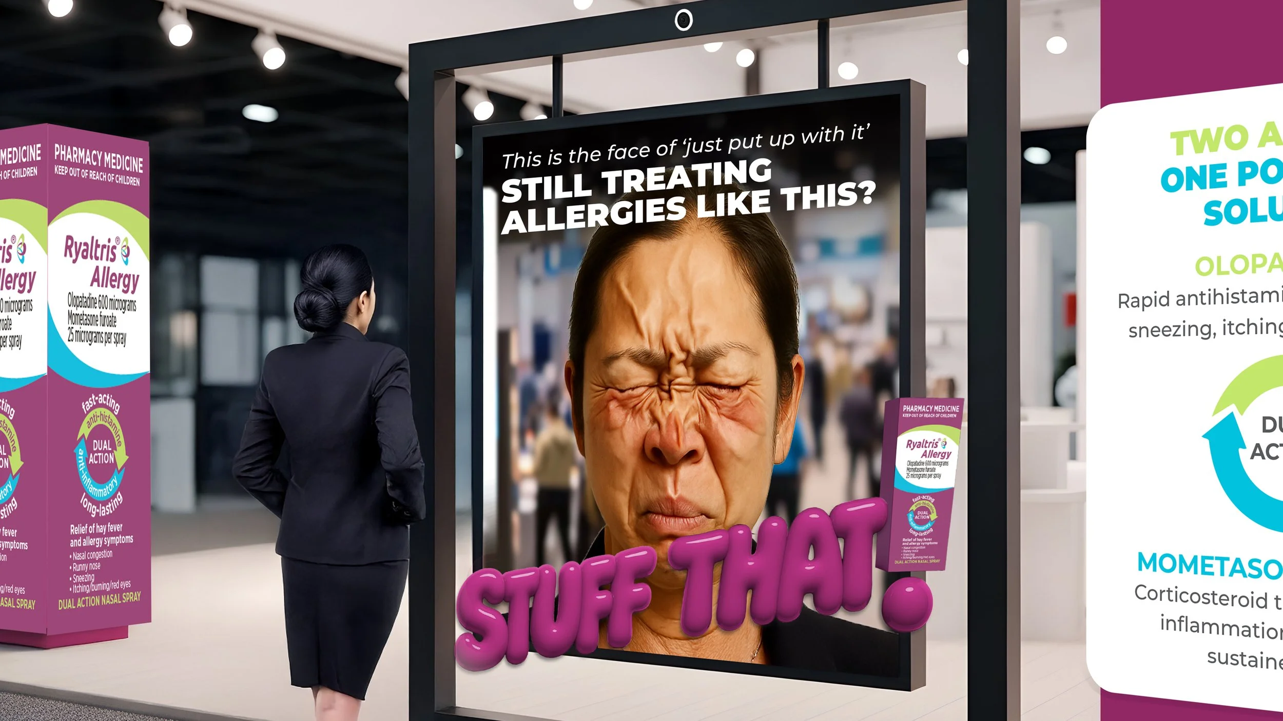 “Stuff that!” A campaign with 'baditude' that stops shoppers in their tracks. It addressed allergy sufferers’ pain points by promoting a dual-action product that relieves symptoms effectively. The campaign connects emotionally, empowering consumers to take control. The creative strategy balanced fluency, fame, and feeling to drive impact. Paired with a bold visual story.